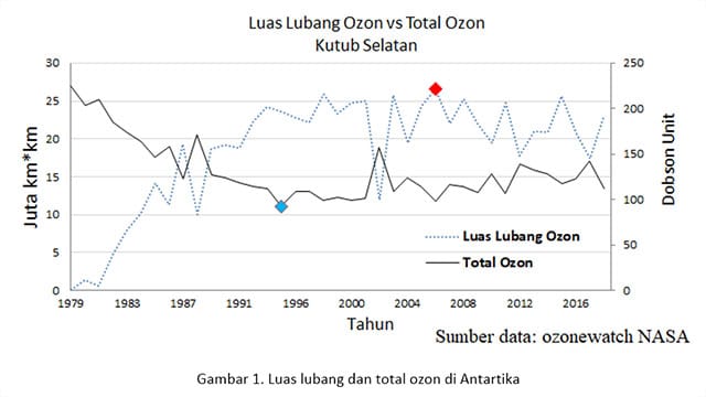 “Terjadi kenaikan luas area lubang ozon sejak tahun 1979 (0 km²) sampai 2018 (22.9 km²), luas maksimum terjadi tahun 2006 (26.6 juta km², titik merah) yang selanjutnya bervariasi sampai tahun 2018. Selain itu, penurunan total ozon (Dobson Unit) mencapai titik minimum tahun 1994 sebesar 92.3 DU (titik biru),” ujar Dodo.