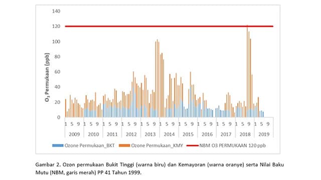 Dodo mengatakan hasil pemantauan menunjukkan (Gambar 2) ozon permukaan di Kemayoran (Jakarta) lebih tinggi dibanding Bukit Tinggi Koto Tabang tetapi keduanya masih dibawah Nilai Baku Mutu (NBM) ozon sebesar 120 ppb. Artinya, kondisi ozon permukaan di lokasi tersebut aman bagi manusia dan lingkungan.