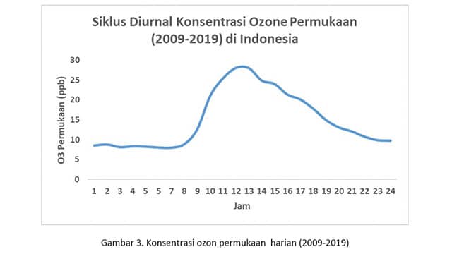 Untuk konsentrasi ozon permukaan harian (Gambar 3) mencapai puncaknya pukul ±12.00 WIB. Konsentrasi yang tinggi ini akibat reaksi radiasi panas matahari dengan gas polutan nitrogen oksida (NOx) yang membentuk ozon.