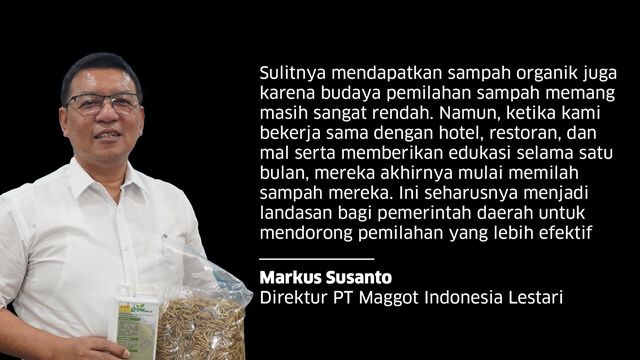 Direktur PT Maggot Indonesia Lestari, Markus Susanto, mengungkapkan jumlah sampah organik di Indonesia sangat tinggi. Namun, pengusaha maggot seperti Markus sering menghadapi kekurangan bahan baku. Hal ini menjadi tantangan tersendiri dalam bisnis maggot.