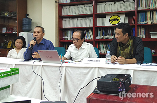 Sekretaris Umum Gaikindo Kukuh Kumara (kemeja biru) dan Kepala Subdirektorat Industri Alat Transportasi Darat, Kementerian Perindustrian, Hendro Luckyanto (paling kanan) dalam Focus Group Discussion (FGD) di Jakarta, Kamis (22/12). Foto: greeners.co/Danny Kosasih