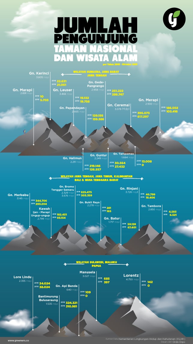 KLHK mencatat sampai Oktober 2019, jumlah pendaki terbesar terdapat di gunung Ciremai, Jawa Barat. Dengan angka 61 persen, jumlah ini naik dibanding tahun lalu, yang berkisar 39 persen. Sedangkan Taman Nasional Bromo Tengger-Semeru, Jawa Timur menempati urutan kedua dengan jumlah pengunjung sebanyak 38 persen, meski angka ini turun dari tahun 2018 yang berjumlah 62 persen.