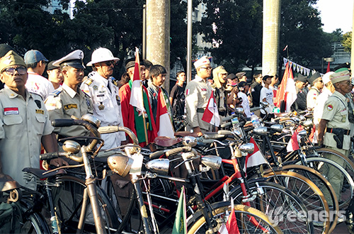 Ratusan pesepeda mengikuti upacara bendera dan pembacaan deklarasi Satu Sepeda Satu Indonesia di depan Pintu Selatan Senayan, Jakarta, Rabu (17/08) pagi. Hingga saat ini, hak pesepeda di jalan raya dirasa masih belum terpenuhi. Foto: greeners.co/Danny Kosasih