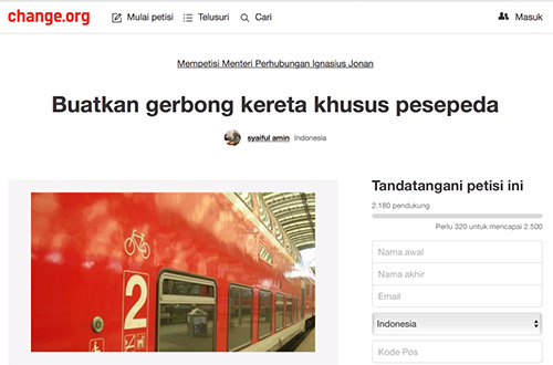 “Banyak pesepeda yang ingin menikmati kota-kota lain di Jawa seperti Bandung…Surabaya dan Jogya. Tujuannya rekreasi sambil olahraga. Masalahnya kita terkadang terkendala regulasi yang memperketat pelarangan orang membawa sepeda kedalam kabin/gerbong kereta sehingga kita sulit melakukan perjalanan sambil membawa sepeda dalam menggunakan kereta api,” tulis petisi yang telah mencapai 2.270 pendukung hingga Rabu (13/07) pukul 16.54 WIB.