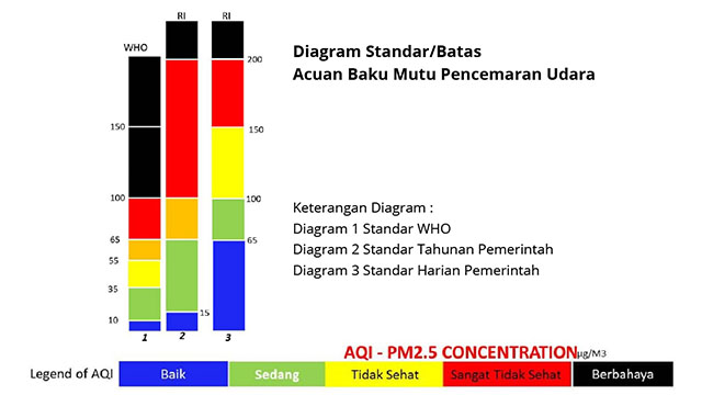 Diagram di atas, memberikan gambaran perbandingan acuan batas pengukuran pencemaran udara, pada diagram nomor satu adalah batas standar WHO, diagram nomor dua adalah batas standar tahunan pemerintah, dan diagram nomor tiga adalah batas standar harian pemerintah.
