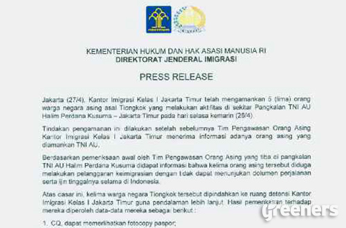 Surat keterangan dari kantor imigrasi terkait penahanan lima pekerja warga negara China yang diduga melakukan pengeboran di wilayah Lapangan Udara (Lanud) Halim Perdanakusuma terkait proyek kereta cepat. Sumber: Humas Dirjen Imigrasi