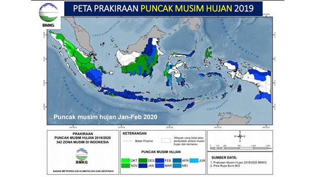 Miming juga menyampaikan, cukup menarik bahwa peta puncak musim hujan, secara normal musim hujan 2019-2020 diprediksi masih pada kondisi normal artinya masih pada kisaran periode Januari-Februari. Sehingga antara November-Desember baru awal musim hujan.