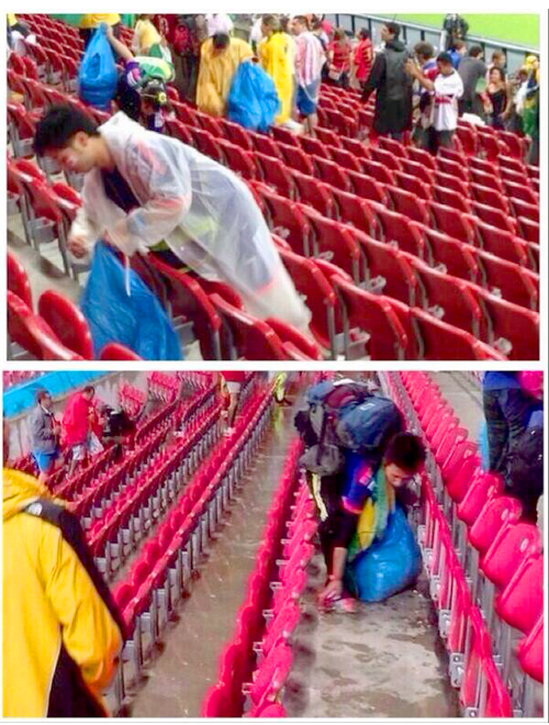 Selama pertandingan, kantong sampah ini dijadikan ‘pom-pom’ untuk mendukung Keisuke Honda dan kawan-kawannya. Namun, begitu usai pertandingan, kantong sampah tersebut benar-benar digunakan untuk memunguti sampah yang berserakan di sekitar mereka.