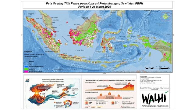 Wahana Lingkungan Hidup Indonesia (Walhi) menyoroti peningkatan sifnifikan karhutla pada Maret 2026. Data Walhi mengungkap sebanyak 1.351 titik berada di dalam konsesi dan sekitar konsesi 15 perusahaan. Dengan rincian 699 titik api di dalam dan sekitar konsesi lima perusahaan sawit, 285 titik api di dalam dan sekitar konsesi lima perusahaan perizinan berusaha pemanfaatan hutan (PBPH), dan 367 titik api di dalam dan sekitar konsesi lima perusahaan tambang.