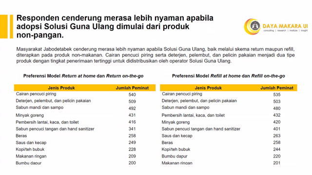 Head of Sustainable Development Research Cluster Daya Makara UI, Bisuk Abraham Sisungkunon mengatakan ada sentimen positif untuk berpartisipasi di dalam solusi guna ulang. Berdasarkan hasil survei, tidak terdapat perbedaan yang signifikan pada kesediaan masyarakat Jabodetabek untuk berpartisipasi dalam model return dan refill.