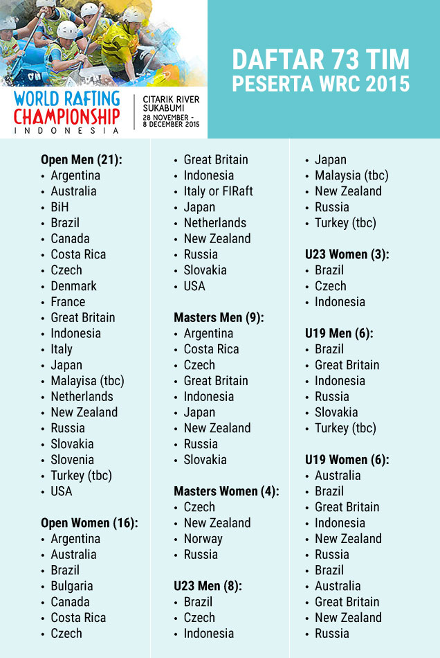 Sebagai informasi, Kejuaraan Kategori R6/Rafting 6 (6 pedayung dalam perahu) ini akan berlangsung di Sungai Citarik, Desa Cijambe, Kecamatan Cikidang, Kabupaten Sukabumi, Jawa Barat, pada 29 November hingga 8 Desember 2015. Sekitar 650 rafter putri dan putra yang tergabung dalam 73 regu asal 24 negara akan berlomba dalam empat kelas, yaitu Master (di atas usia 40 tahun), Terbuka (untuk semua kelas), Youth/Remaja, di bawah usia 19 tahun (Under-19) dan Junior (U-23).