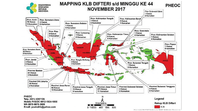 Berdasarkan data yang diperoleh dari situs resmi Kemenkes RI, Provinsi Jawa Timur menduduki peringkat pertama sebagai provinsi dengan kasus difteri terbanyak se-Indonesia. Hingga bulan November 2017, sebanyak 271 kasus difteri telah ditemukan di Provinsi Jawa Timur, dan 11 di antaranya telah menelan korban jiwa. Provinsi Jawa Barat dan Banten menduduki peringkat kedua dan ketiga setelah Jawa Timur. Sebanyak kurang lebih 176 kasus difteri telah menerpa Provinsi Jawa Barat dan Banten. Mewabahnya difteri diduga disebabkan oleh adanya immunity gap di suatu daerah.