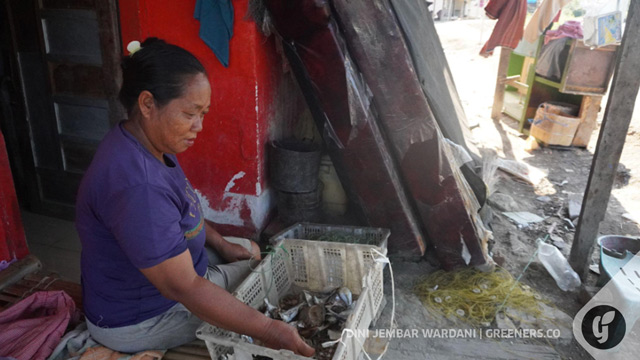 Sairoh (44) sedang mengeringkan ikan hasil tangkapan suaminya di kediamannya, Kampung Muara Kuntul. Foto: Dini Jembar Wardani