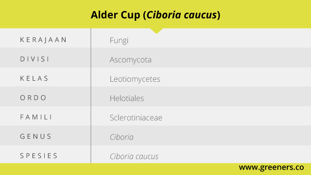 Di samping itu, jamur alder cup pertama kali ahli botani dan mikologi Jerman Johann Friedrich Rebentisch deskripsikan pada tahun 1804 dengan nama ilmiah Peziza caucus. Kemudian di tahun 1870 ahli mikologi Jerman lainnya, Karl Wilhelm Gottlieb Leopold Fuckel mempublikasikan nama yang hingga saat ini digunakan yakni Ciboria caucus.