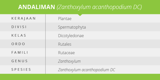 Andaliman (Zanthoxylum acanthopodium DC) merupakan tumbuhan yang termasuk dalam famili Rutaceae. Secara geografis, persebaran andaliman banyak tumbuh di Cina dan Himalaya. Di Indonesia, tumbuhan ini banyak ditemukan tumbuh liar di beberapa daerah Sumatera Utara, pada ketinggian 1.200 – 1.400 mdpl.
