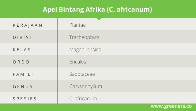 African star apple mempunyai nama latin Chrysophyllum africanum. Spesies ini tergabung ke dalam genus Chrysophyllum dan famili Sapotaceae, sehingga berkerabat dengan C. albidum.