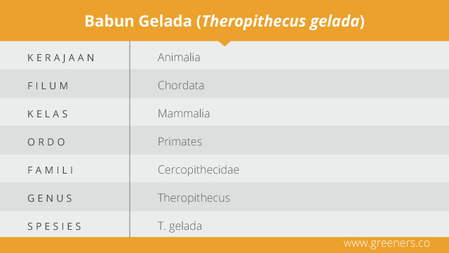 Gelada mempunyai nama ilmiah Theropithecus gelada. Hewan ini masih berkerabat dengan mangabey, kipunji, monyet drill, dan monyet dukun. Namun, mereka berasal dari genus yang berbeda.