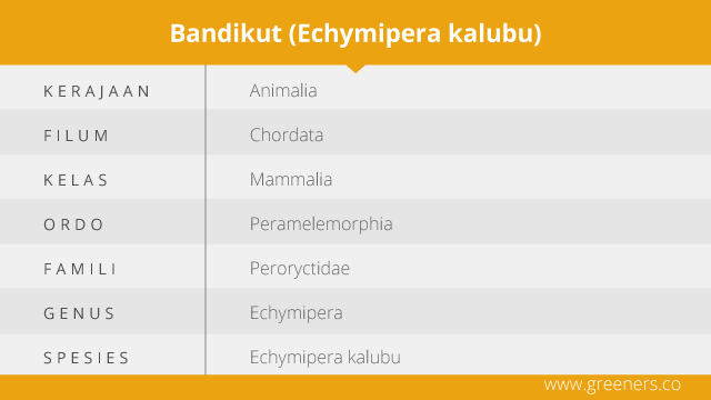 Papua menjadi wilayah yang memiliki keragaman jenis satwa tinggi. Salah satunya hewan endemis berjenis marsupialia atau berkantong bernama bandikut. Dengan nama latin Echymipera kalubu, tikus babi ini merupakan hewan nokturnal, soliter, dan omnivora. Di dunia jumlahnya sebanyak 21 spesies dan sebagian besar hanya ditemukan di Papua Nugini hingga sedikit di pesisir utara dan timur Australia.