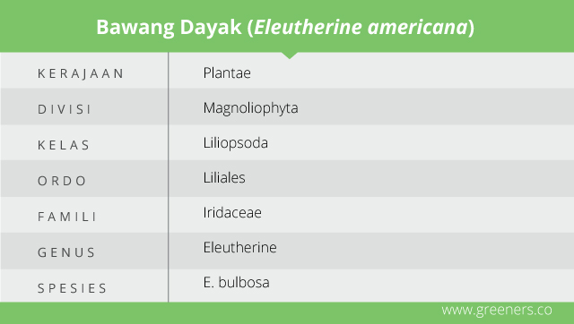 Secara klasifikasi, bawang tiwai memiliki nama latin Eleutherine bulbosa. Beberapa orang menyebutnya sebagai E. palmifolia atau E. americana, yang mana adalah sinonim dari binomial bawang tersebut.