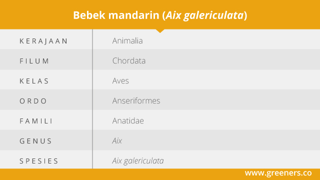 Jika dilihat sekilas, bebek ini terlihat cukup identik dengan kerabatnya bebek kayu, dan juga terlihat mirip dengan bebek mallard. Tapi dapat dibedakan dari bebek mallard berdasarkan garis mata itik mandarin yang berhenti di bagian mata. Sedangkan garis mata bebek mallard panjang hingga ke paruhnya.