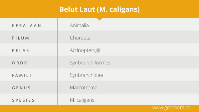 Melansir Jurnal Ilmiah Universitas Atma Jaya Yogyakarta, belut adalah sekelompok ikan yang mirip seperti ular dan tergabung dalam suku Synbranchidae. Kelompok hewan ini terdiri dari banyak jenis, salah satu anggotanya yaitu Belut Laut atau Macrotema caligans.