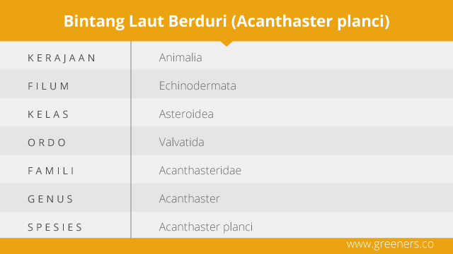 Bintang laut berduri atau Acanthaster planci disebut juga Crown of Thorns (COTs) dalam Bahasa Inggris. Fauna yang juga dikenal sebagai kaki seribu laut atau bulu seribu ini dapat ditemui di ekosistem terumbu karang. Bintang laut berduri merupakan salah satu jenis bintang laut raksasa dengan jumlah duri yang banyak. Organisme ini memiliki potensi penyebab kerusakan yang cukup luas di ekosistem terumbu karang (Yamaguchi, 1986; Pratchett, 2001).