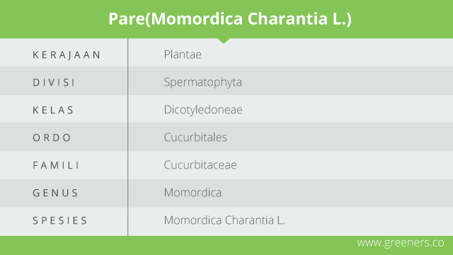 Pare (Momordica charantina L.) merupakan tanaman tropis dan subtropis dari famili cucubitaceae. Tanaman ini banyak ditemukan di Asia Selatan, Asia Tenggara, China, Afrika dan Karibea. Penamaan lokal pare beragam, di Jawa disebut dengan paria, pae, pare pahit dan pepareh. Sedangkan di Sumatera dikenal dengan nama prieu, peria, foria, pepare, kambeh, paria dan prie. Di Sulawesi buah ini disebut poya, pudu, pentu, paria belenggede dan palia. Dalam bahasa Inggris pare dikenal dengan penamaan bitter melon.