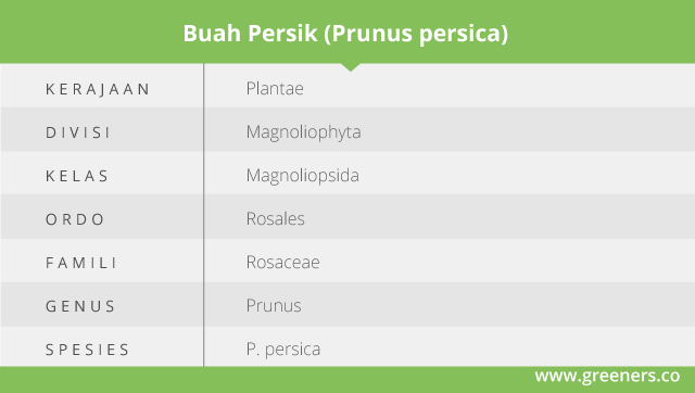 Spesies P. persica tergabung dalam famili Rosaceae. Tanaman ini masih berkerabat dengan buah ceri, aprikot, almon dan plum, sebab berasal dari satu genus yang sama yakni Prunus.