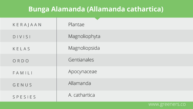 Alamanda merupakan satu dari 1.000 lebih spesies Apocynaceae yang tersebar di daerah tropis. Tumbuhan ini berasal dari genus Allamanda, sehingga mempunyai nama ilmiah Allamanda cathartica.
