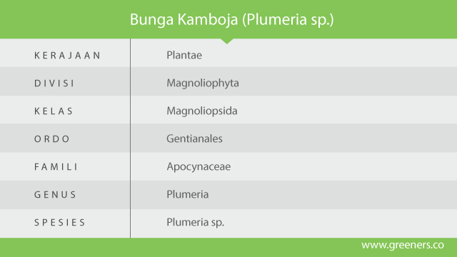 Asal muasal tanaman kamboja adalah dari Amerika Tengah. Nama plumeria diberikan untuk menghormati Charles Plumier, seorang ahli botanis asal Perancis di abad ke-17. Kamboja dapat tumbuh di daerah tropis dan sub tropis dan iklim tropis Indonesia sesuai dengan kebutuhan tumbuh bunga kamboja. Bunga pada kamboja memiliki keunikan yang khas yaitu beraroma harum saat malam hari.