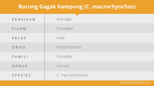 Burung gagak yang paling umum ditemui di sekitar kita adalah jenis burung gagak kampung (Corvus macrorhynchos) atau dalam penamaan bahasa Inggris disebut large-billed crow. Gagak ini masuk ke dalam burung pemakan segala, mulai dari bangkai hewan sampai buah-buahan.