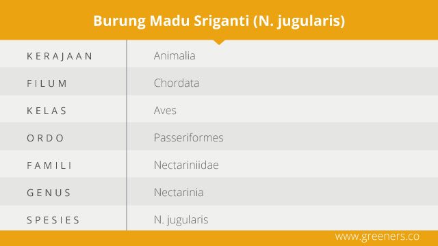Berdasarkan klasifikasinya, burung sriganti tergolong sebagai unggas berordo Passeriformes. Ia datang dari keluarga Nectariniidae, serta memiliki genus Nectarinia dan kelas burung Aves.