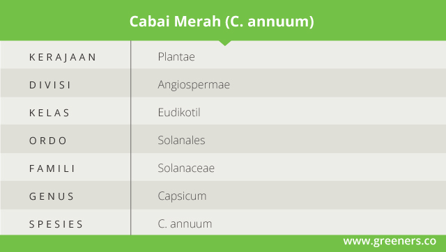 Cabai merah dikenal juga sebagai Capsicum annuum. Spesiesnya berasal dari ordo Solanales dan famili Solanaceae, sehingga berkerabat dengan cabai rawit atau Capsium frutescens.