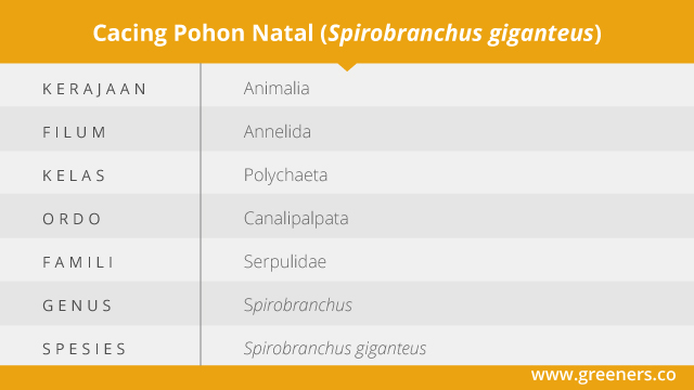 Disebut cacing pohon natal karena bagian tubuhnya yang keluar dari liang terlihat seperti pohon natal. Nama genus Spirobranchus berarti insang spiral, dan giganteus yang artinya raksasa, merujuk pada fakta bahwa cacing ini adalah yang paling besar di antara Serpulidae lainnya.