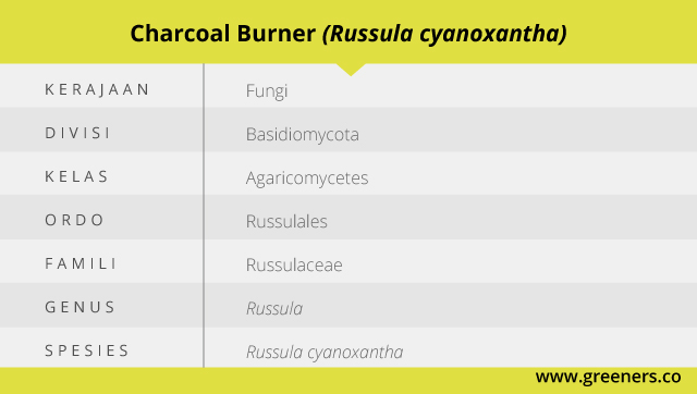 Jamur charcoal burner, Jacob Christian Schaeffer deskripsikan pada tahun 1762 dengan nama ilmiah Agaricus cyanoxanthus. Kemudian pada tahun 1863, ahli mikologi Swedia, Elias Magnus Fries, menetapkan nama ilmiahnya yang saat ini diterima sebagai Russula cyanoxantha.