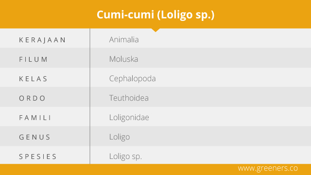 Cumi-cumi merupakan kelompok hewan yang memiliki kaki di kepala (cephalopoda). Mereka juga termasuk ke dalam golongan hewan tidak bertulang belakang (invertebrate). Nama Cephalopoda dalam bahasa Yunani berarti kaki kepala. Sebab kaki cumi-cumi terpisah menjadi sejumlah tangan yang melingkari kepala. Seperti semua Cephalopoda, cumi-cumi dipisahkan oleh kepala yang berbeda (Sarwojo, 2005).