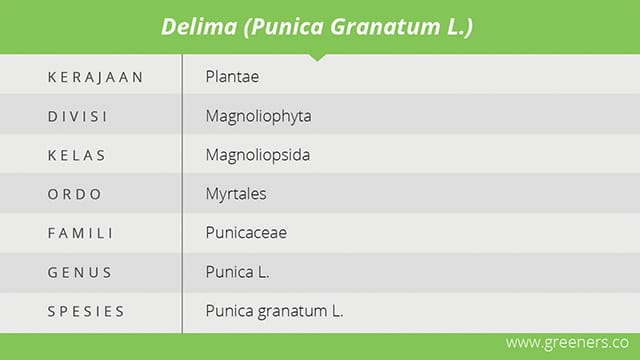 Delima dikenal memiliki tiga macam buah, yaitu delima putih, delima merah, dan delima ungu. Buah delima dapat dimakan dalam keadaan segar, sebagai campuran rujak buah, salad buah, jus atau sari buah (Sasongkawati Retno, 2013). Buah delima merah memiliki rasa yang manis dengan biji-biji buah yang merah menyala, daging buahnya berair (Marhari dan Dewi, 2014).