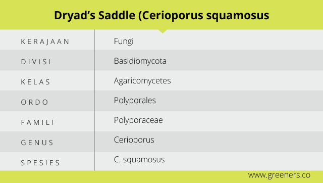 Dryad’s saddle atau pelana Driad tergabung dalam famili Polyporaceae dan genus Cerioporus. Ia memiliki nama ilmiah Cerioporus squamosus, serta cukup populer dengan julukan jamur punggung burung.