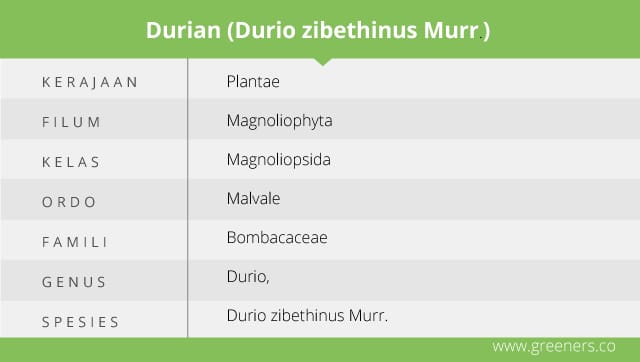Buah dengan julukan “The King of Fruits” ini termasuk dalam famili Bombaccaceae dan banyak ditemukan di daerah tropis. Tiap pohon durian dapat menghasilkan 80 sampai 100 buah, bahkan hingga 200 buah terutama pada pohon yang tua. Tiap rongga buah terdapat 2 sampai 6 biji atau lebih.