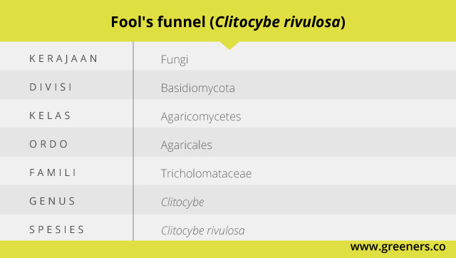 Jamur corong bodoh, champignon palsu, atau Fool’s funnel dikenal juga dengan ilmiah Clitocybe rivulosa. Berasal dari famili Tricholomataceae yang beranggotakan lebih dari 100 genus.