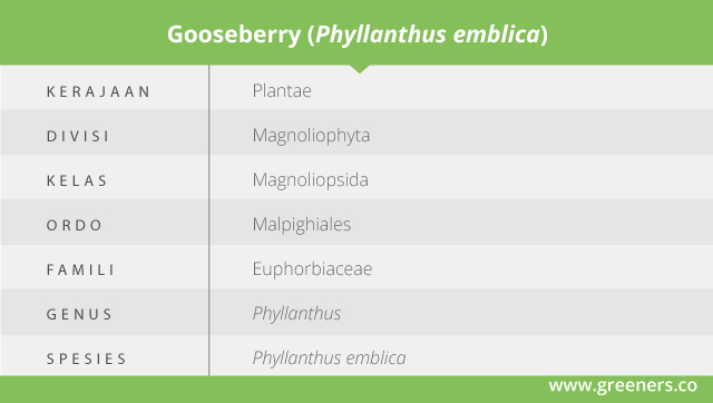 Gooseberry (Phyllanthus emblica) di Indonesia memiliki berbagai nama seperti balakka, metengo, kimalaka, kemloko, atau malaka. Tanaman yang berasal dari famili Euphorbiaceae ini merupakan tanaman obat dengan berbagai biokativitas dan juga bergizi tinggi. Pertama kali terpublikasi pada tahun 1753 dalam buku “Species Plantarum”.