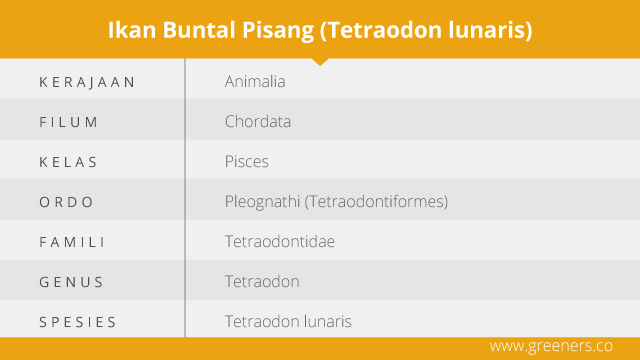 Kelompok ikan ini pun ada yang hidup di perairan tawar. Pada umumnya mereka menyukai daerah perairan yang tenang dan berlumpur (Kottelat et al. 1993). Ikan buntal pisang termasuk ke dalam Ordo Tetraodontiformes. Nama Tetraodontiformes berasal dari morfologinya yang terdiri dari dua gigi besar pada rahang atas dan bawah.