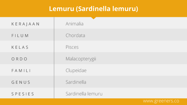 Dari karakteristiknya, ikan lemuru berbadan memanjang agak bulat dengan sisik lebih halus dibanding Clupeidae lainnya. Sementara tutup insang bagian bawahnya membentuk sudut dan kuping insangnya ibarat setengah lingkaran. Di belakang tutup insang ada noda kuning kehijauan diikuti garis kekuningan pada gurat sisi (lateral line). Punggung lemuru berwarna gelap dengan warna perut keperakan.