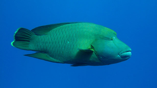Ikan ini juga memiliki sepasang gigi yang tajam yang keluar dari mulutnya. Dari segi keunikan warnanya, ikan Napoleon dewasa memiliki warna kehijau-hijauan (hijau botol). Sedangkan ikan yang sudah berusia tua dan besar umumnya memiliki wama biru kehijau-hijauan.