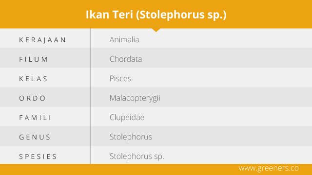 Bernama Latin Stolephorus sp., ikan teri bersifat pelagis dan bertempat di perairan pesisir maupun estuaria. Namun, beberapa jenis dapat hidup pada salinitas rendah antara 10 sampai 15 persen. Ikan teri tersebar luas di laut Pasifik bahkan sampai ke daerah Tahiti dan Madagaskar (Nontji, 2005) dalam Hastuti (2010). Ikan pelagis ini termasuk jenis ikan musiman. Musim tangkapan berada antara bulan Februari sampai Agustus. Jumlah tangkapan tertinggi biasanya terjadi pada bulan Juli dan Agustus.