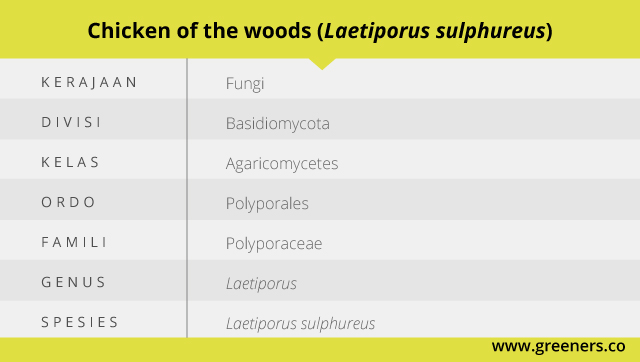 Jamur chicken of the woods berasal dari famili Polyporaceae dan berkerabat dengan Poria cocos (Wolfiporia extensa), Trametes hirsuta (Hairy Bracket), Polyporus squamosus (Dryad’s Saddle), dan lainnya.