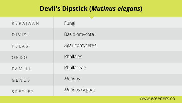 Jamur Mutinus elegans dikenal juga dengan nama Devil’s Dipstick, The Elegant Stinkhorn, dan The Headless Stinkhorn. Berasal dari famili Phallaceae, keluarga jamur stinkhorn. Berkerabat dengan jamur Mutinus caninus (Dog stinkhorn) dan Mutinus ravenelii (Red Stinkhorn). Selain itu, jamur Devil’s Dipstick dikenal juga memiliki aroma yang tidak sedap seperti bau daging busuk.
