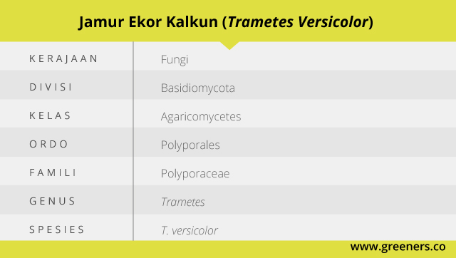Turkey tail mushroom atau jamur ekor kalkun tergabung dalam famili Polyporaceae dan genus Trametes. Ia memiliki nama ilmiah T. versicolor, serta masih berkerabat dengan lumpy bucket.