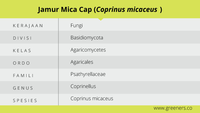 Jamus Mica Cap dapat dikenali dari butiran-butiran halus seperti mika yang menghiasi tudung barunya. Meski Mica Cap bisa kita makan, tapi tak memiliki banyak rasa. Jamur ini juga dapat cepat mencair menjadi cairan berisi spora hitam pekat dalam waktu 1 hingga 3 jam.