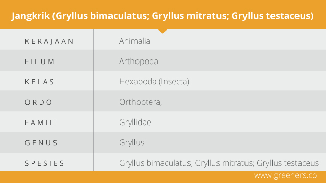 Jenis jangkrik yang saat ini banyak dibudidayakan para pembudidaya secara intensif diantaranya jenis kalung (G. bimaculatus), cendawan (G. testaceus) dan cliring (G. mitratus), dimana masing-masing dari spesies ini memiliki ciri-ciri fisik dan warna yang berbeda. Contohnya pada jangkrik kalung, jangkrik ini memiliki kulit dan sayap luar berwarna hitam atau agak kemerahan. Pada bagian punggung (pangkal sayap luar) terdapat garis kuning sehingga menyerupai kalung (Widiyaningrum, 2001).